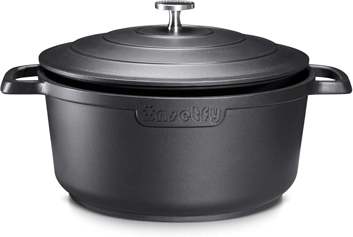 The lightweight 5 qt nonstick cast aluminum Dutch oven with lid and two handles is perfect for those who want the benefits of traditional Dutch ovens without the heaviness. Its elegant design with looped handles makes it easy to handle, while the rapid heat distribution ensures your meals cook evenly every time.
