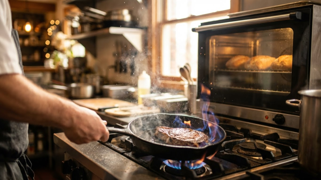 Gas heats a pan almost instantly because the flame transfers energy directly to the cookware. I can raise or lower heat in seconds, which helps with tasks like searing steak or bringing a pot to a boil fast. This quick response cuts active cook time when I need high heat right away.