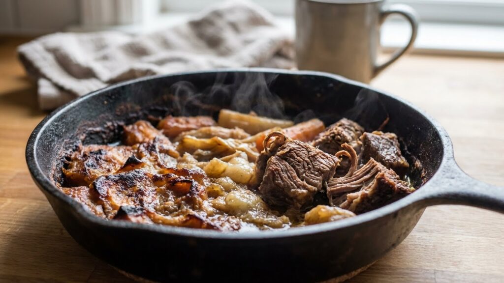 Slice large pieces thinly before reheating so heat reaches the center quickly. For roasts or steak, use a low oven (275–300°F / 135–150°C) on a rack inside a baking pan with a few tablespoons of beef or chicken broth added to the pan. Cover loosely with foil to trap steam and reheat until the center reaches 165°F (74°C).