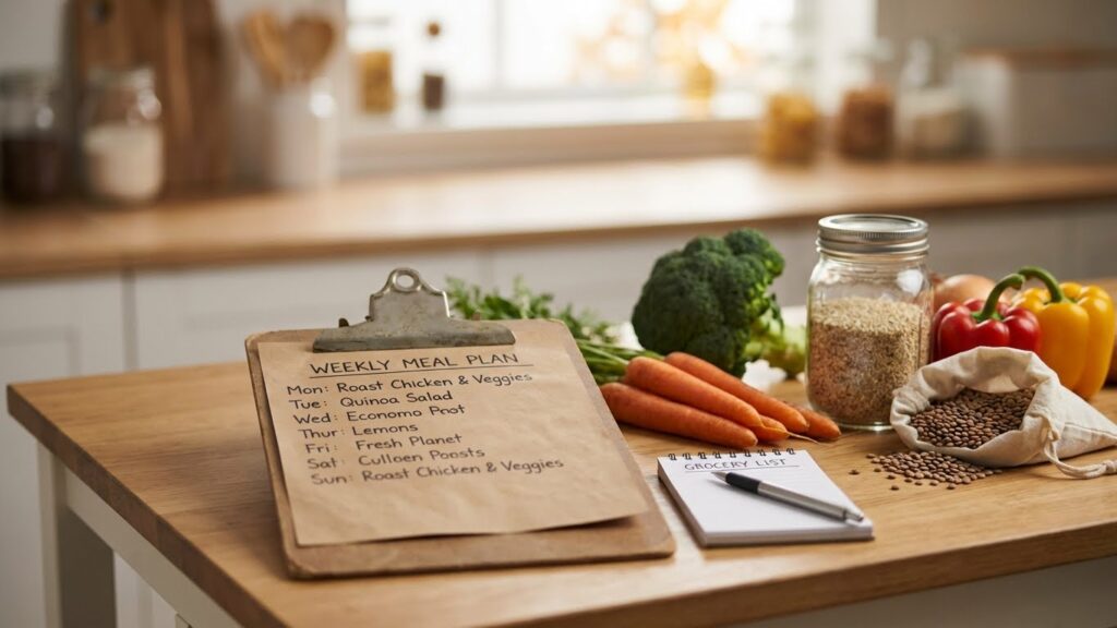 I write the plan on a single sheet or app with portions, so I don’t guess amounts midweek. This prevents last-minute takeout and keeps costs lower.