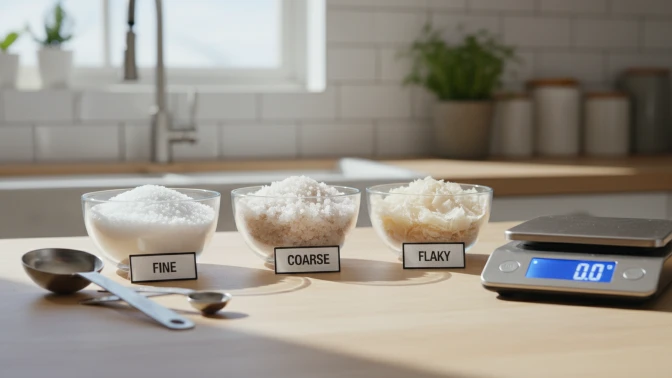 Adjust volume, not just weight, when swapping salts. Different crystals mean different saltiness by volume: 1 teaspoon of fine table salt is saltier than 1 teaspoon of kosher salt. Weigh salts when precision matters, or follow brand-specific conversion (e.g., Diamond Crystal vs. Morton).